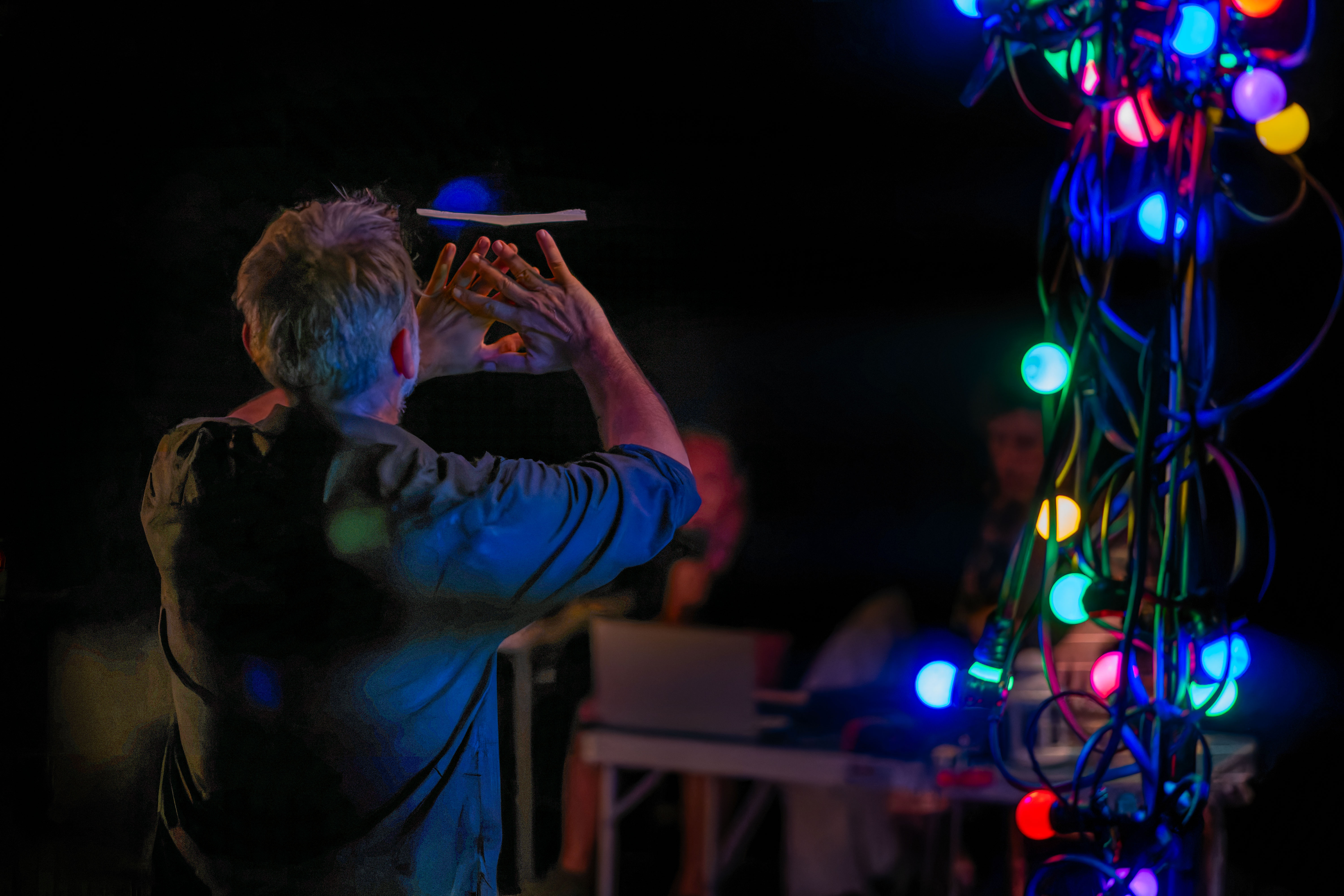 Un jongleur, manipulateur d’objets flottants joue avec les sensations afin de révéler les fragilités et les déséquilibres qui nous traversent.